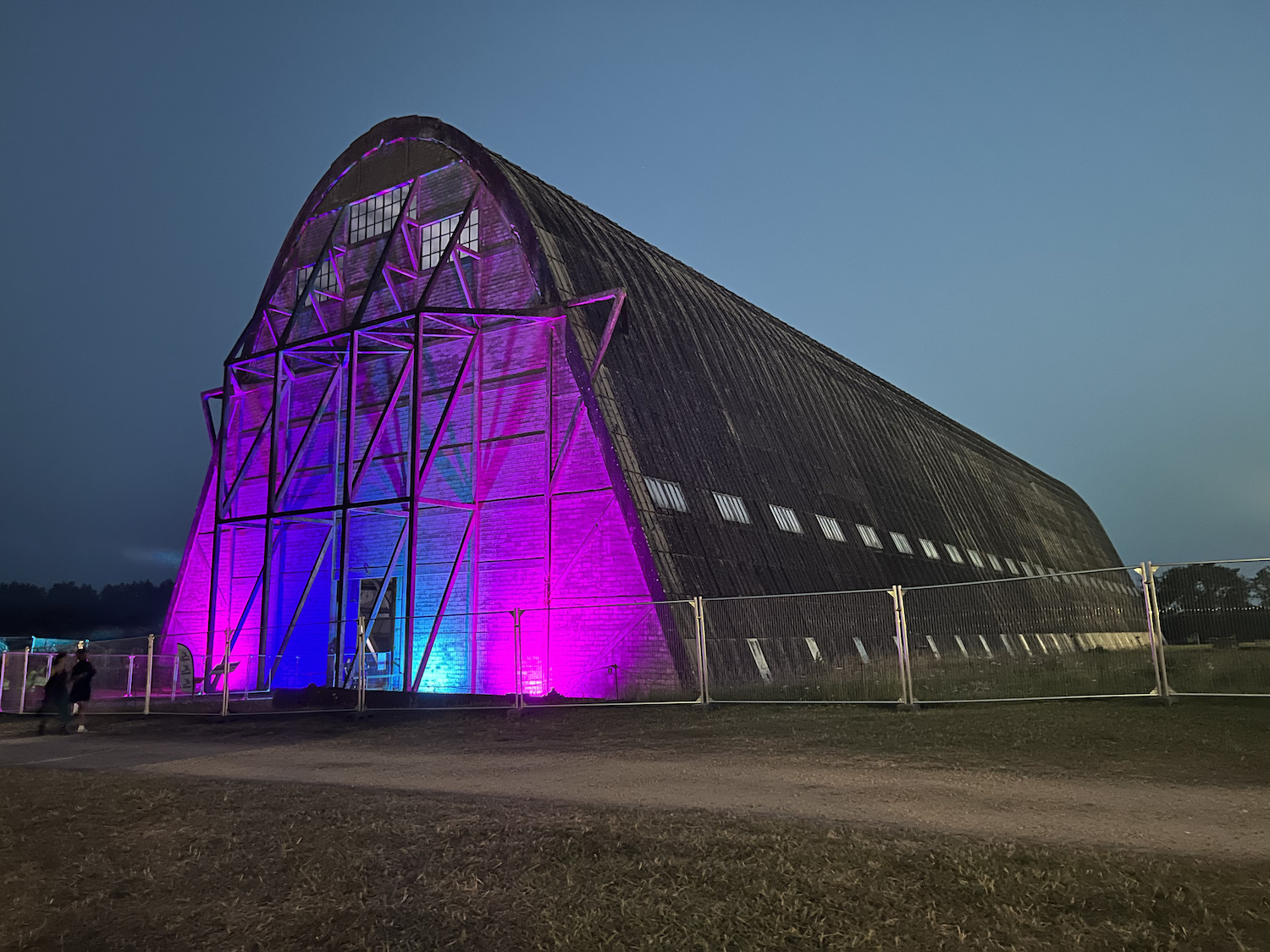Un gros travail scénique a été réalisé sur les deux scènes du festival. Le Ring et la Minard en avaient mis plein les mirettes des intrépides fans de musiques électroniques en plus de l’immense hangar à dirigeables érigés pendant la Seconde Guerre mondiale. À la fin du premier soir, tous les ingrédients étaient là pour passer une seconde soirée de folie. La DJ résidente du Macadam, 소윤 (Soyoon) avait bien lancé la soirée avec un séduisant set hybride entre vinyle et digital, enchaînant les morceaux bien diggés et dansants, lors d’un set pile à l’heure de l’apéro. À 23 heures, La Mverte avait ensuite pris le relais sur le Ring. Cette scène camouflée dans un écrin de piliers métalliques disposés en cercle et reliés entre eux par de gigantesques draps blancs, donnait l’impression d’être dans une salle à ciel ouvert, participant à l’architecture soignée du site du festival. Elle qui n’a pas manqué de faire son petit effet. Tout comme les visuels acides du festival, violets et verts, qu’on retrouvait sur les gobelets éco-cups estampillés de… la marque de bière 8.6, audacieuse partenaire de l’évènement dont on a plus l’habitude de retrouver les canettes lors de nos « soirées shlag » qu’en festival. Quelle surprise ! Toutefois oubliez la bière à 12°, la 8.6 se dégustait dans sa surprenante version IPA ce week-end, et devant Voiron s’il vous plait. Le DJ-producteur breton a retourné le public de la scène Minard dans un live à la sauce techno saisissante, saupoudrée de morceaux drum n’bass cathartiques. Parfait pour le public de Nord Fiction, qui ne semblait attendre qu’une percée du genre, après s’être pris en pleine face la voix de diva de Mathilde Fernandez sur la gabber et la techno de Paul Seul, son binôme d’ascendant vierge. La prestation live des deux intrépides compères et artisans de la musique électronique sur le Ring, en a presque fait oublier au public la bonne performance de Roi Perez sur l’autre scène, pourtant à la hauteur. La Normandie a totalement été sous le charme des bangers organiques du duo et happé par la puissance de la voix de Mathilde Fernandez. On aurait presque fait abstraction du site bourré d’Histoire sur lequel on se situait…
