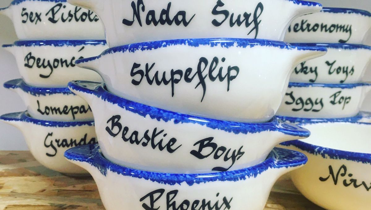 Led Zeppelin, Pink Floyd, New Order mais aussi Nina Simone, Rosa Parks ou le Marquis de Sade (pour le groupe rennais ou l’icône littéraire, c’est vous qui voyez) figurent parmi les noms que vous pouvez retrouver sur les bolets, ou Rock’n Bols, de l’artiste rennais Mathieu Renard. Il revisite les fameux « bols à oreilles de Quimper » sur lesquels il peint les noms de grandes célébrités.